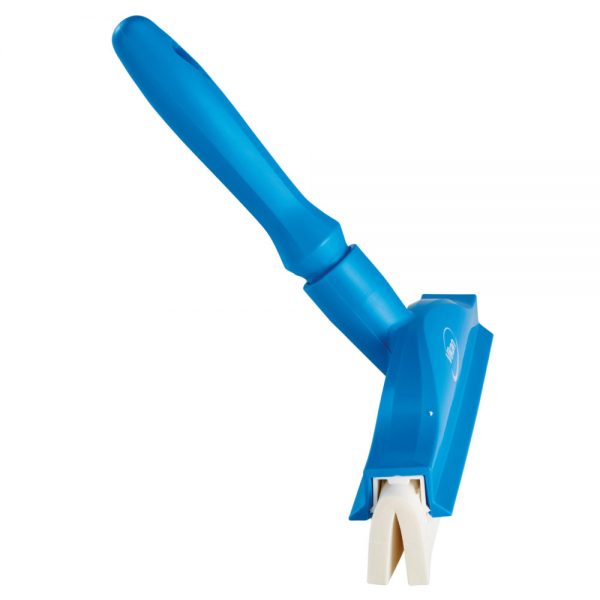 Double blade hand squeegee provides effective removal of both water and food debris from food preparation surfaces. The cassette is removed easily for cleaning or replacement. Replacement squeegee blade 77715