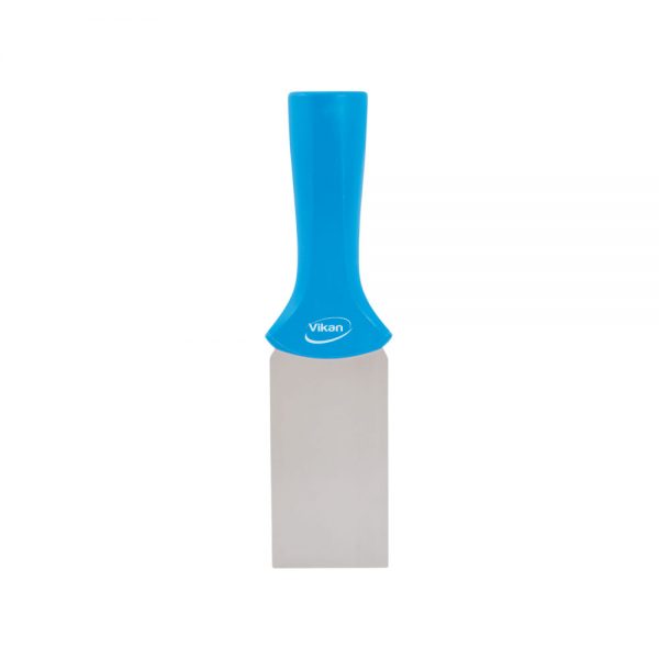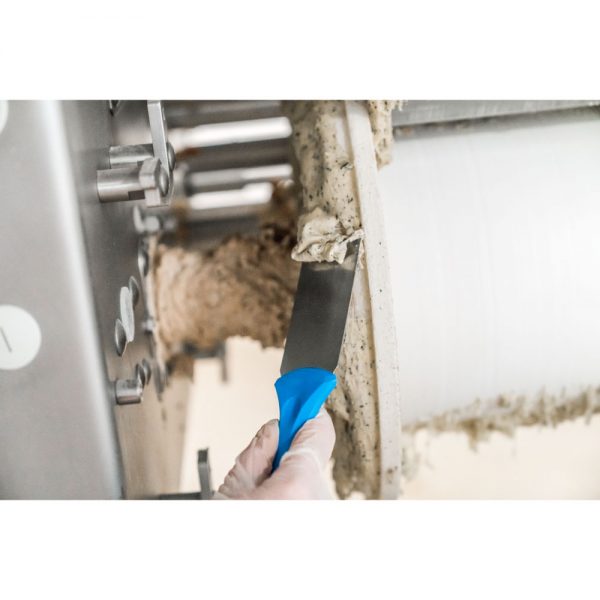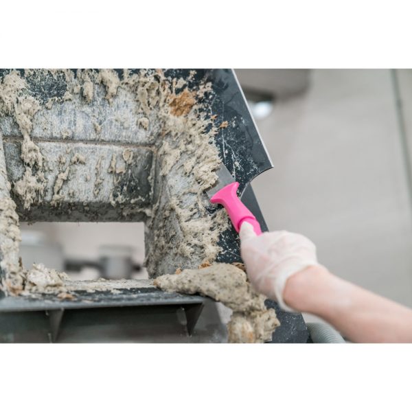 Good for removing sticky, semi-liquid deposit, like dough, confectionary gels/pastes, soft chocolate, cheese etc. as these would clog a brush very quickly. Is good for removing dried or burnt on deposits, like hardened chocolate, caramel, dried/burnt bakery debris, compacted dried powders or powders that have become stuck to a surface, dried/burnt meat, fish or vegetable deposits etc. because they enable the user to exert more mechanical force against the dried on soil than can be achieved with a brush.